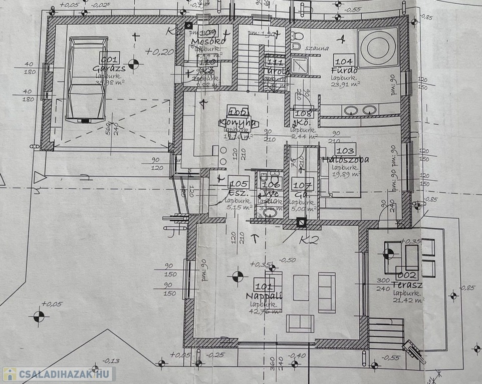 Balra a kétállásos garázs található, mellette pedig az elegáns, savmart díszítésű biztonsági bejárati ajtón keresztül érkezünk a házba. Először a tágas előszobába lépünk, ahonnan szemben a a földszinti mellékhelyiséget, jobbra az igényes, napfényes, kandallós, 43 nm-es, teraszkapcsolatos nappalit, balra pedig a 19 nm-es, étkezős konyhát találjuk. A konyha magasfényű konyhabútorával, egészében csúcsminőségű Siemens gépesítésével minden igényt kielégít. A konyhából balra előre nyílik a mosókonyha, jobbra pedig a 20 nm-es, tágas földszinti hálószoba. A hálószobához kapcsolódik egy 5 nm-es gardróbszoba, ugyaninnen nyílik a 24 nm-es, jakuzzis masszázskáddal, WC-vel és zuhanyzóval is ellátott földszinti fürdőszoba. A nappaliból és a hálószobából is megközelíthető a 21 nm-es, üvegtáblákkal teljesen zárt, redőnnyel felszerelt terasz, amelyből igény esetén teljes értékű szabad terasz nyitható az üvegtáblák eltolásával.