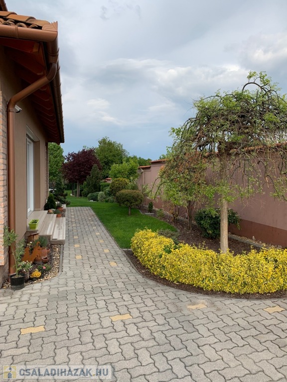 A csendes mellékutcából, kovácsoltvas elektromos működtetésű kapun keresztül a terjedelmes, térkővel burkolt előkertbe érkezünk, innen tárul elénk a 2011-ben épült, egyedi stílusú családi ház.