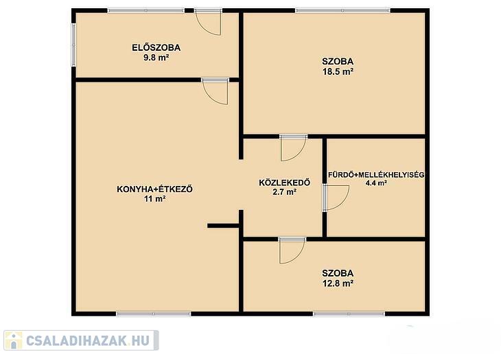 2 külön nyíló szoba, étkező és konyha, fürdőszoba és mellékhelyiség, előszoba, közlekedő.