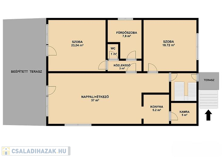 ELRENDEZÉS: 2 szoba, étkezős nappali, konyha, zuhanyzós + kádas fürdőszoba, mellékhelyiség, beépített terasz, kamra.