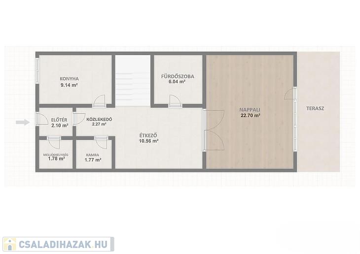 Földszint: Nappali, konyha, étkező, kamra, zuhanyzós fürdőszoba, mellékhelyiség, közlekedő, előszoba.