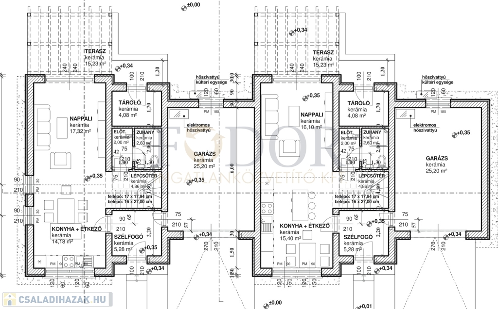 A kivitelezés magas műszaki tartalommal történik: az épületek beton sávalapra épülnek, 30 cm-es főfalakkal és 10 cm-es válaszfalakkal. A tetőt beton cserépfedés borítja, a homlokzat 10 cm vastag grafitos hőszigetelést kap. A háromrétegű üvegezésű nyílászárók kiváló hő- és hangszigetelést biztosítanak, míg a hőszivattyús fűtés padlófűtéssel gondoskodik az energiatakarékos, egyenletes hőérzetről. Klímakiállások, valamint elektromos kapu- és garázsnyitás előkészítése is beépítésre kerül.