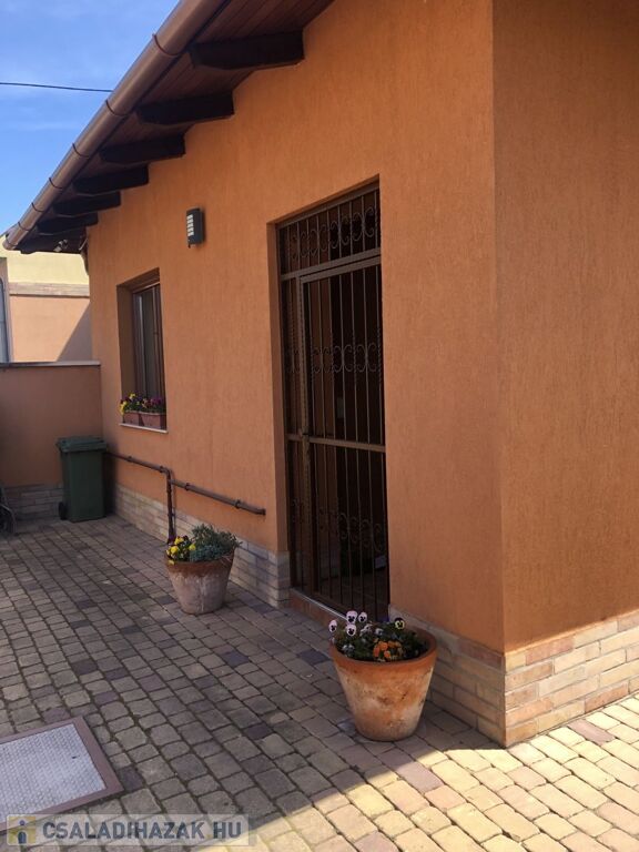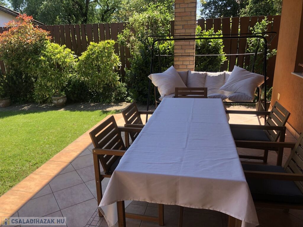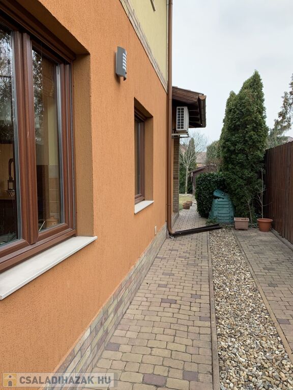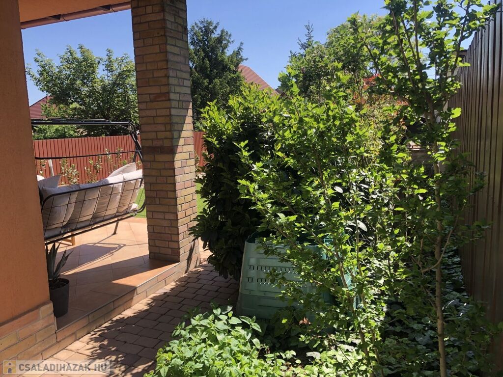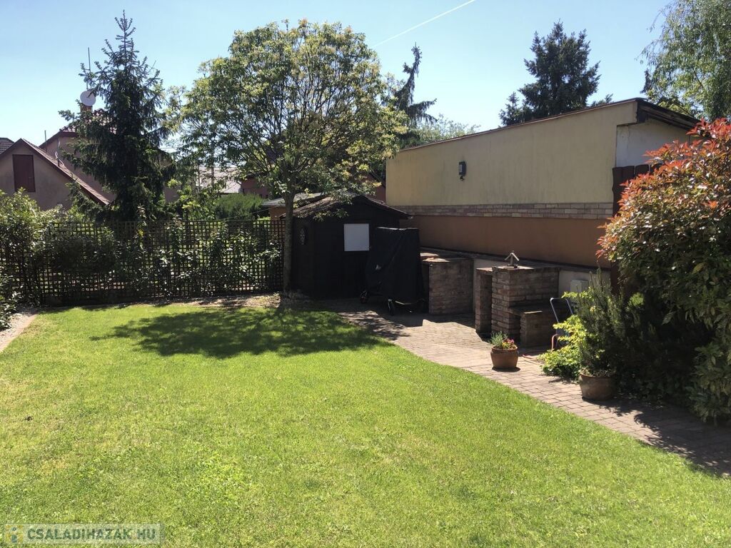 A kert maga igazi zöld oázis: az automata locsolórendszer nemrégiben került felújításra, a korábbi tujasor helyére babérmeggybokrok kerültek, amelyek jól tűrik a mediterrán jellegű klímát, így a kerítés mentén egész évben gondozott, zöld látvány fogad. Az udvart új, modern válaszkerítés határolja az ikerszomszéd felé, a kert többi részét körülölelő fakerítés pedig tavaly friss festést kapott. A kerti tárolásról egy kis faház gondoskodik, amely tökéletes kerékpárok, kerti szerszámok vagy gyerekjátékok elhelyezésére. Az udvar térkövezett részén akár három autó is kényelmesen parkolhat egymás mögött, elektromos kapu biztosítja a gyors ki- és bejutást.