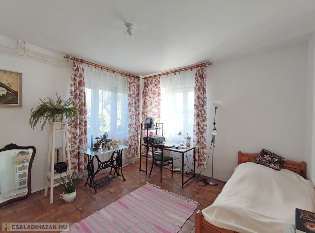 A családi ház az 1958-ban épült betonozott alapzattal, kisméretű vörös téglából, amelyre (a ’70-es évek végén elkezdett és a ’80-as évek elején befejezett), az alsó szint kibővítésével ráépített a tulajdonosa egy új szintet, 30-as falazóblokkal, betonfödémes, zsindelyes héjalással, ÉK-i fekvéssel. Így egy jó elosztású, szintenként szinte teljesen egyforma kialakítású, nagyon tágas és világos szobákkal rendelkező 2 generációs családi ház lett.