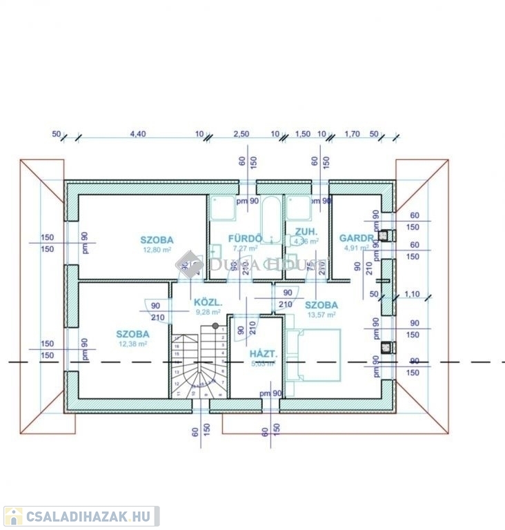 Emeleten: 2 szoba, 1 felnőtt hálószoba azon belül nyílik egy gardrób és zuhanyzó+wc, közlekedő, további fürdőszoba+wc.