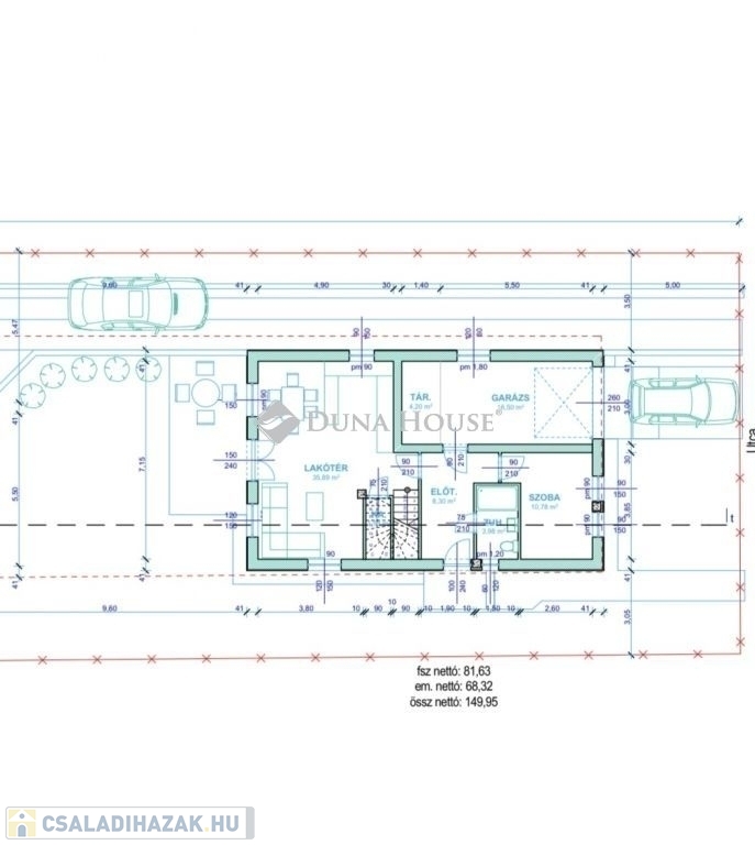 Földszinten: Tágas nappali+konyha étkező, zuhanyzó+wc, előtér, szoba, garázs 18.50 m2 , tároló, nyitott terasz.