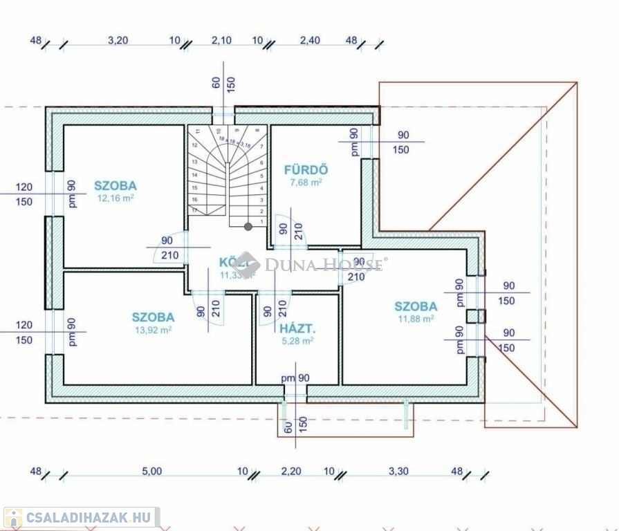 Emeleten: 3 szoba, fürdő+wc, háztartási helyiség, közlekedő.