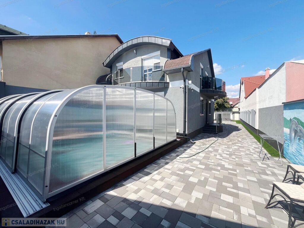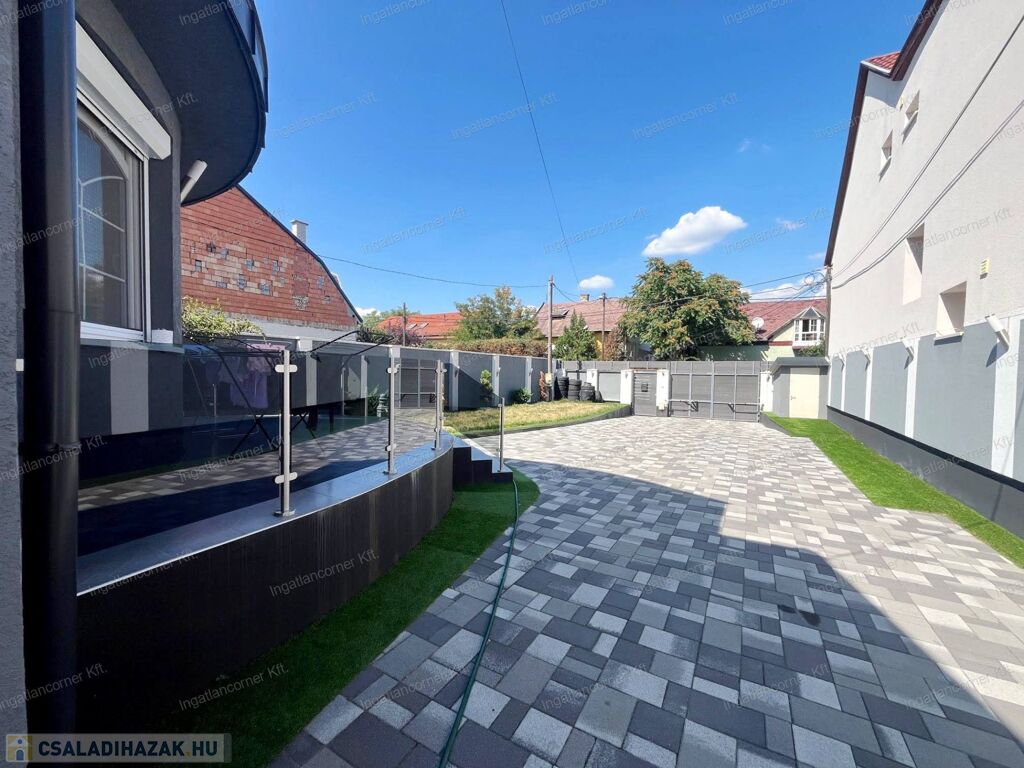 Eladó luxus ikerházfél medencével, több terasszal és teljesen felszerelt kerti konyhával Pest-Lőrinc egyik legkedveltebb utcájában!