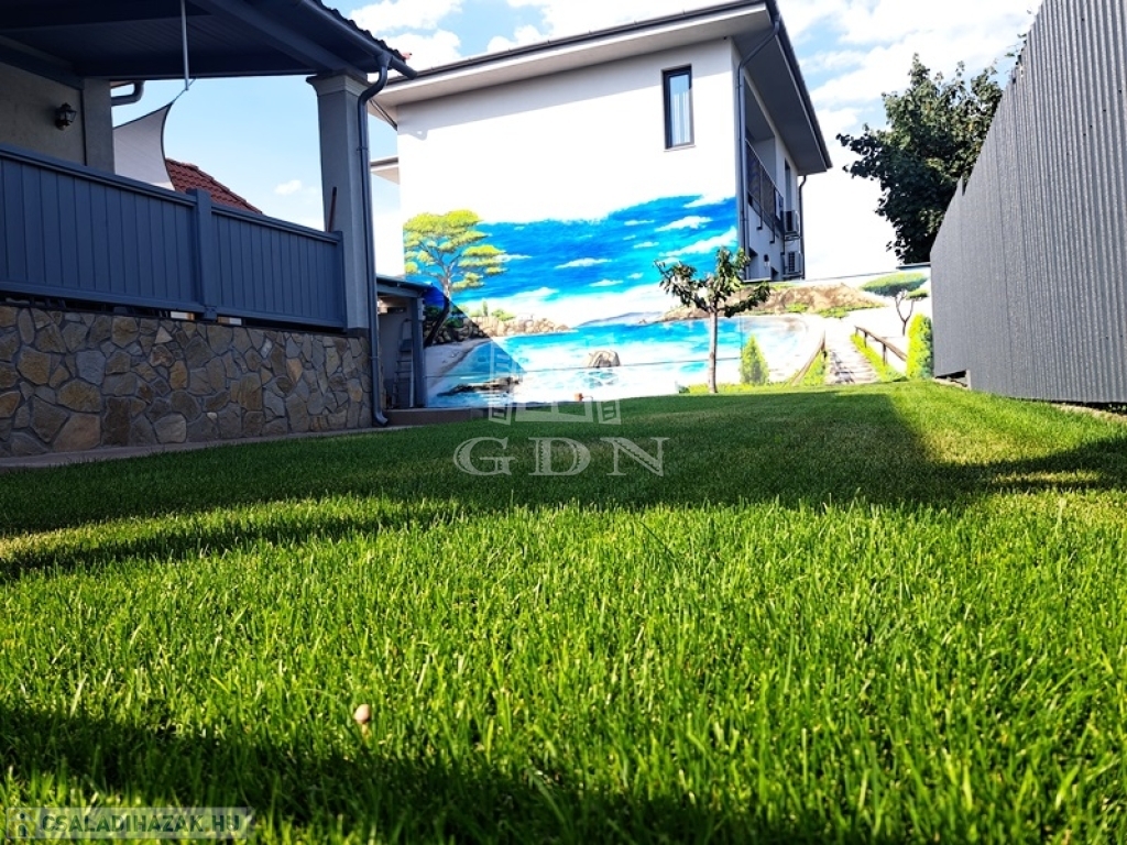 Az intim kert rendezett parkosított, két autó számára fedett autóbeálló áll rendelkezésre.A kert öntözését fúrt kút biztosítja.