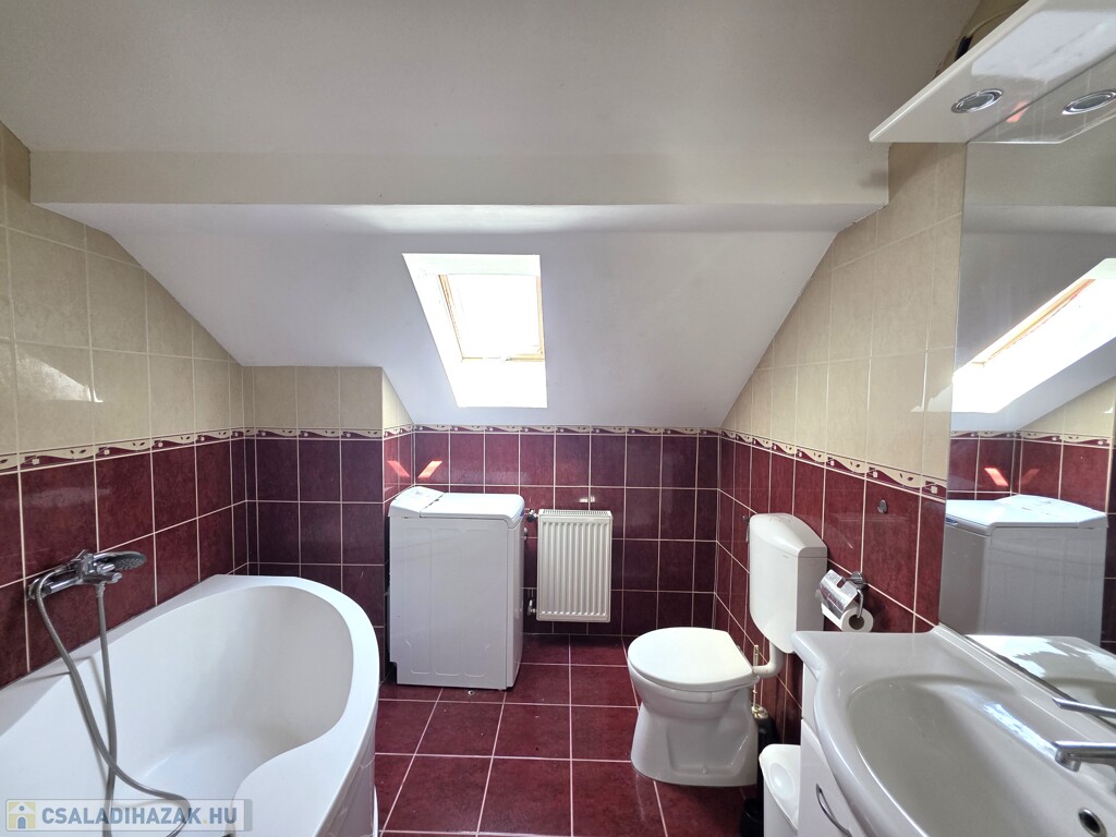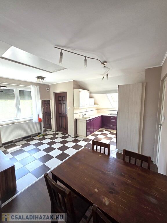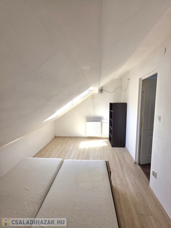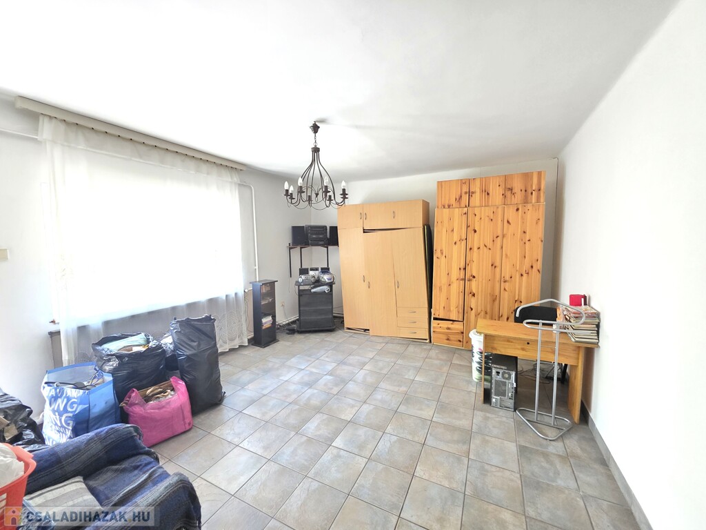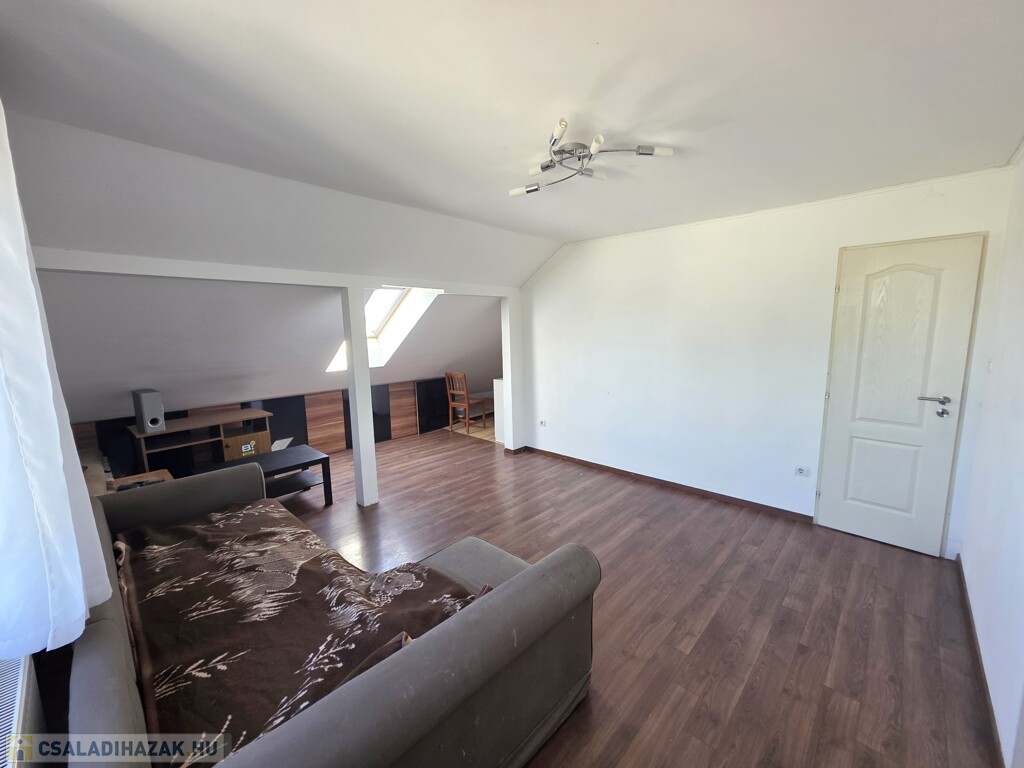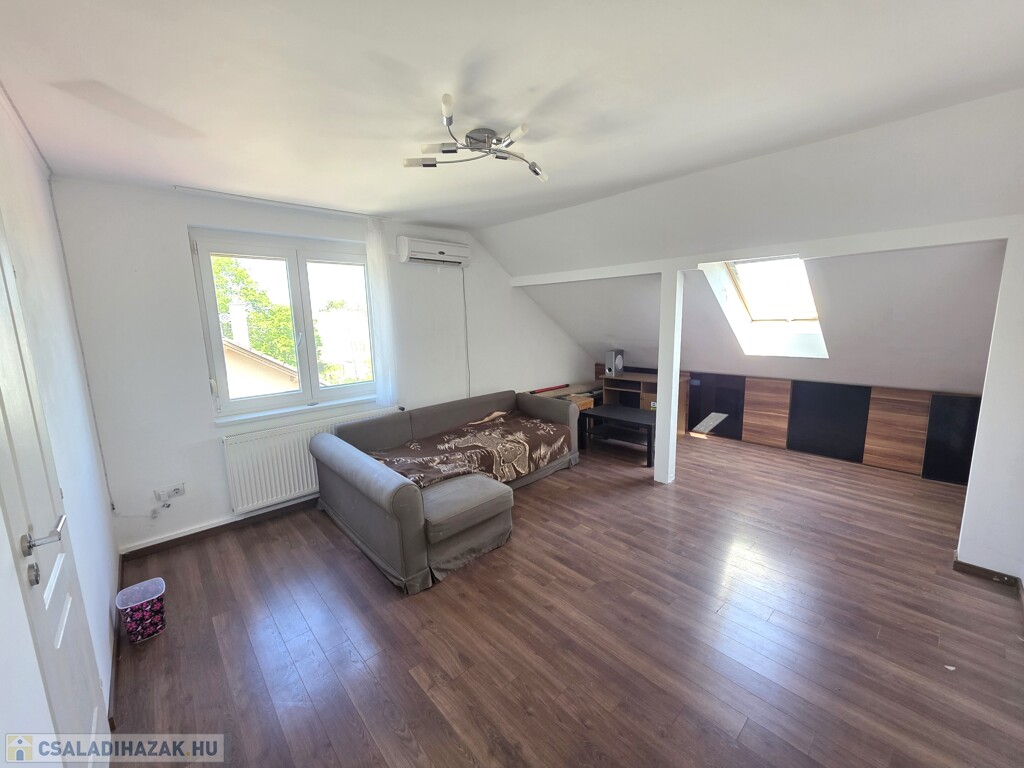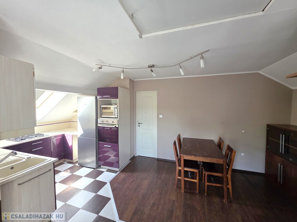 Emeleti lakás (93 m²): Felújítandó állapotú, tágas terekkel (3 nagy szoba, konyha-étkező, külön fürdő és WC) Minden helyiség az étkezőből nyílik. Saját erkélye van, valamint egy nagyobb terasz a garázs tetején kialakítható.