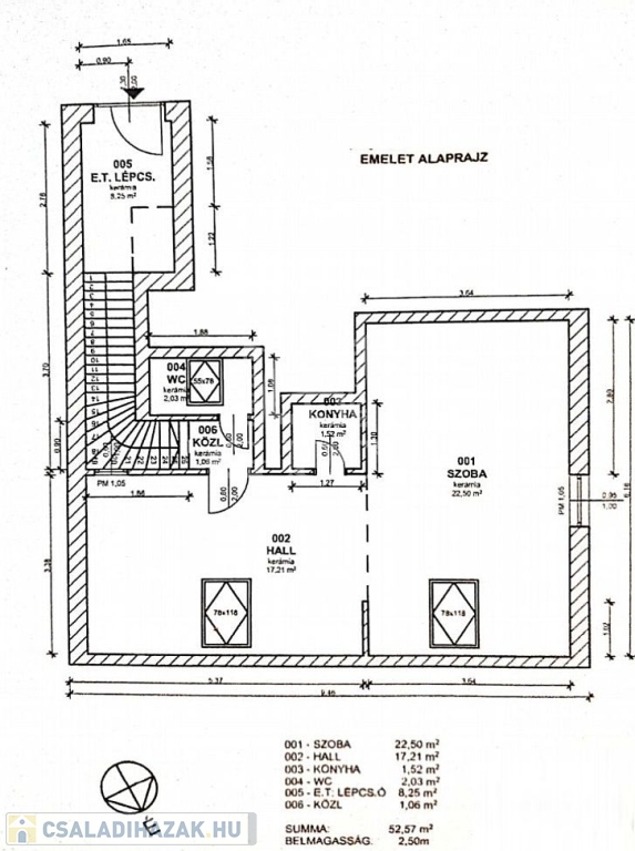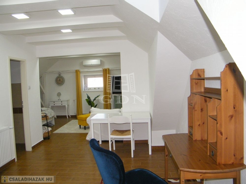 A külön bejáratú emeleti szint nettó 52,5 nm; itt egy szoba, hall, teakonyha és wc található