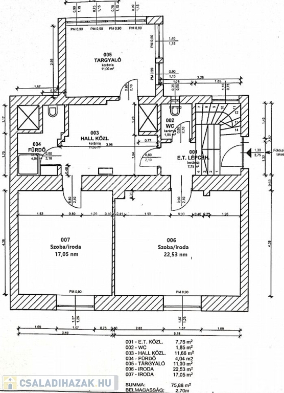 A lakóépület földszintjén 2,5 szoba hall, fürdőszoba és wc található, nettó 75,88 nm alpterülettel.