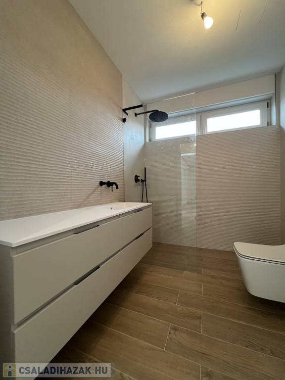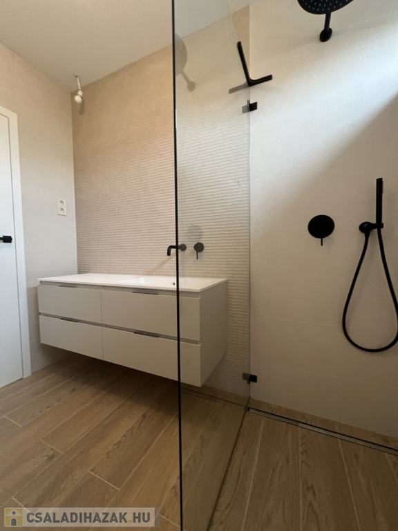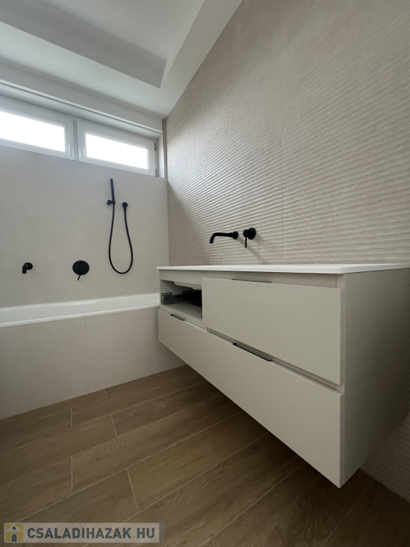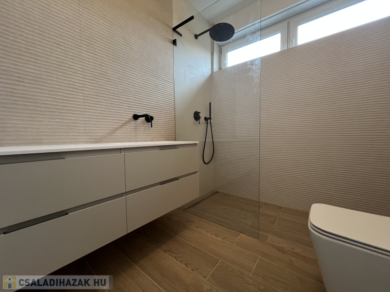 Beépített design csaptelepek, egyedi fürdőszoba szekrényekkel, design szaniterek, Geberit folyókákkal, síkba záródó egyedi belső ajtókkal, kulcslyuk nélküli, design kilincsekkel. Kiépített Okos Otthon, nagy értőképernyős riasztóval, arcfelismerős kaputelefonnal, hűtő-fűtő klímák, elektromos kapuk, elektromos garázsajtók.