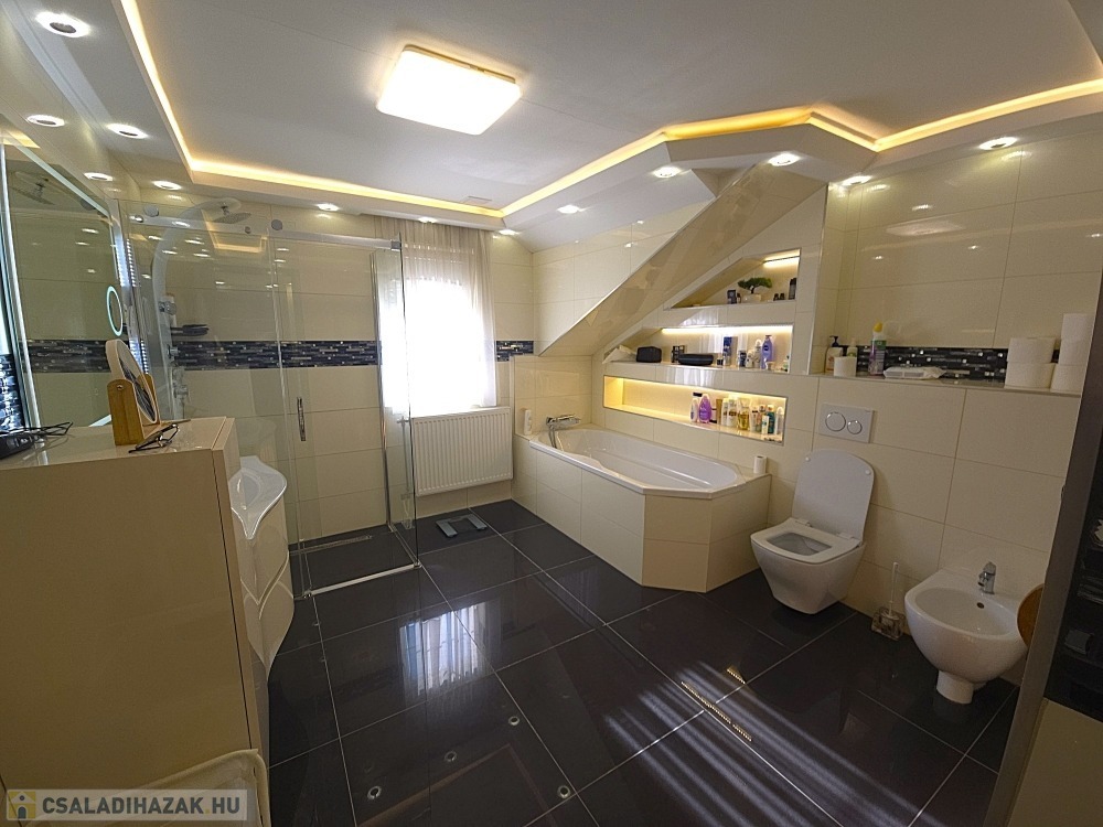 A fenti fürdőszoba kádas és zuhanyzós kialakítású, piszoárral és beépített szaunával, a wellnes-élmény otthon is adott.