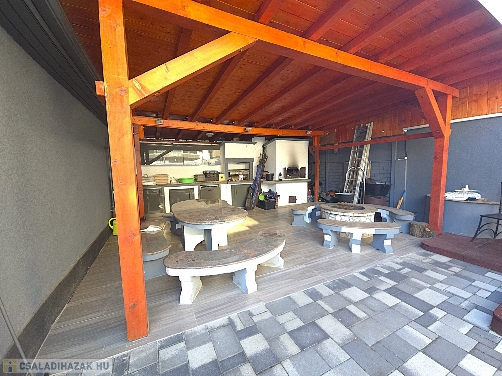 Innen nyílik a hangulatos első terasz, míg hátul helyezkedik el a garázs WC-vel és mosdóval, valamint a kerti sütögető, grillező és a kemence rész.