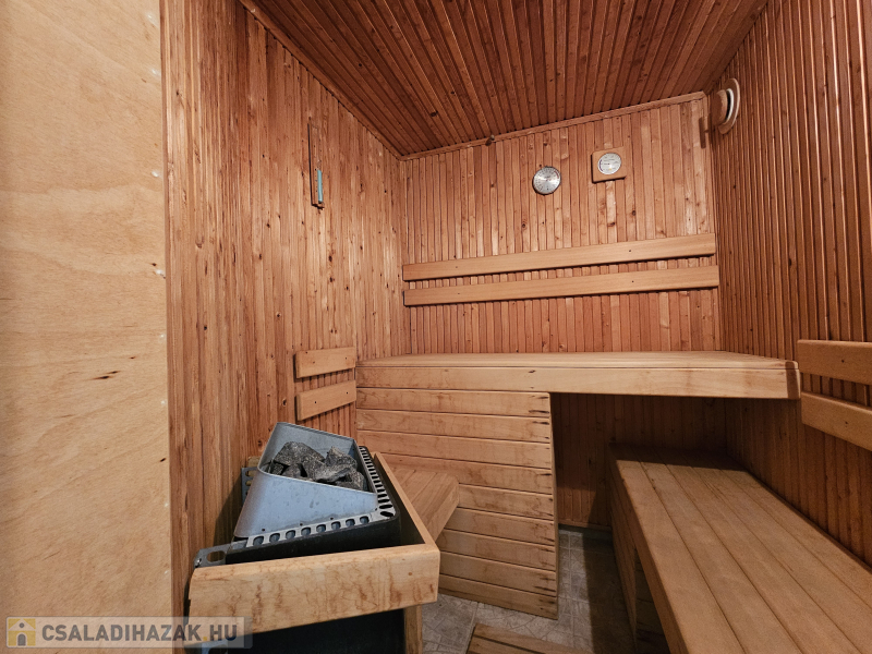 Földszint: nagyméretű nappali, konyha, étkező, fürdőszoba, gardróbszoba, előszoba, wellnes helyiség szaunával, merülő medencével, wc-vel, zuhanyzóval,mely a kertből, teraszról is megközelíthető!