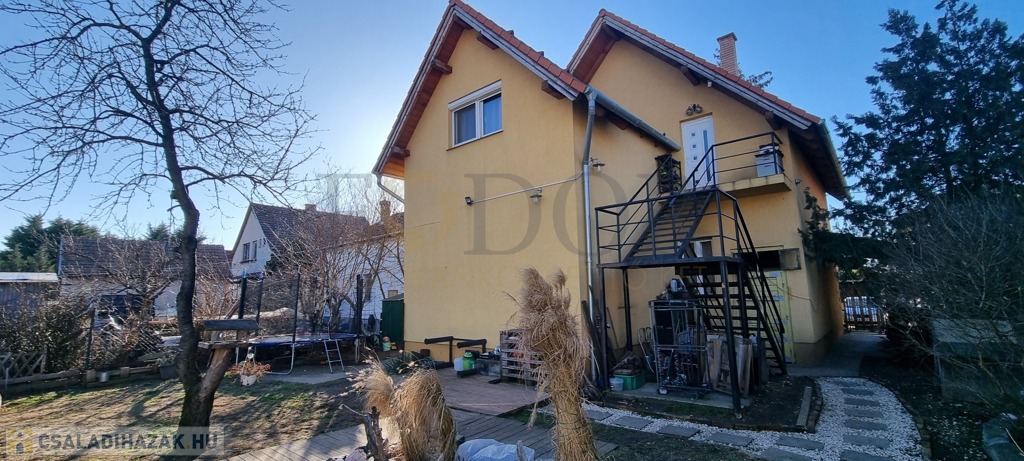 Telek és kert: A telek jelenleg osztatlan közös tulajdon, ügyvéd által ellenjegyzett telekhasználati megállapodással a házrészhez tartozó, privát 215 négyzetméteres telekterülettel. Az elválasztó kerítés kiépítése folyamatban van, a vételár részét képezi. A kert gondozott, WPC burkolatú sétáló- és kiülő résszel, halastóval, valamint több autó számára biztosított parkolási lehetőséggel. Az épület mellett fedett gépkocsibeálló is található.