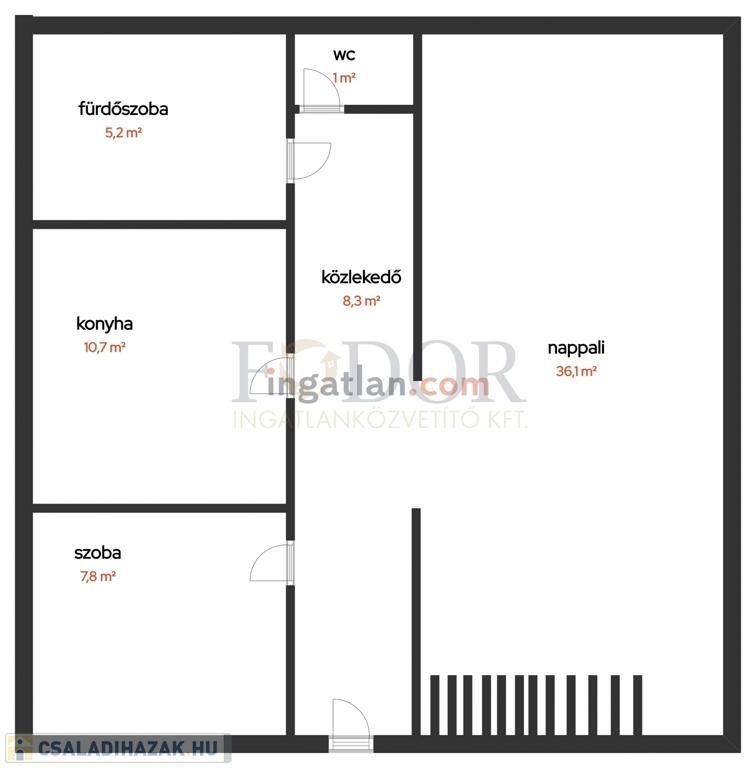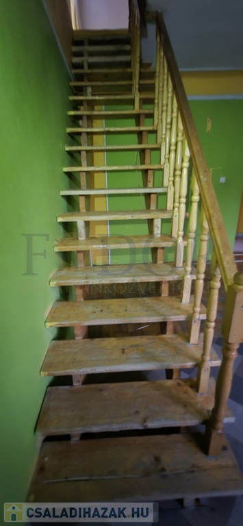 • Földszint: előszoba, közlekedő, egy szoba, konyha, fürdőszoba, külön WC, valamint egy 36 m²-es tágas nappali, fa lépcsővel az emeletre.