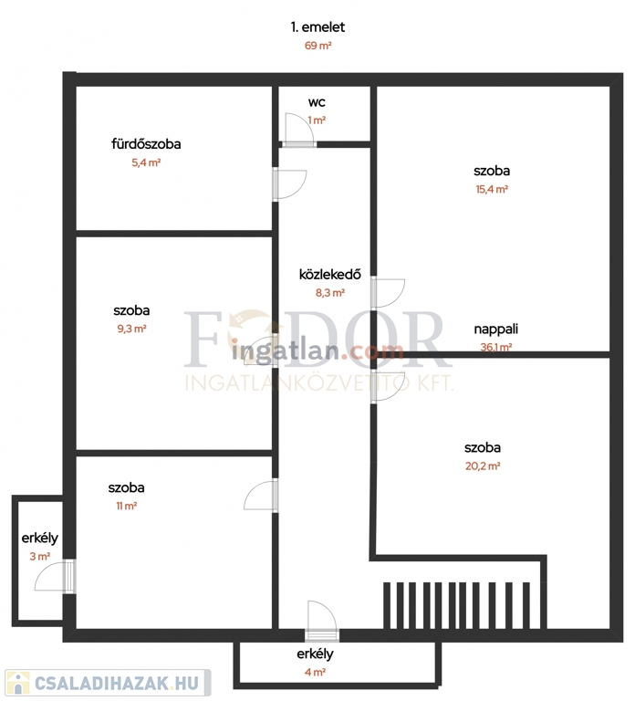 • Emelet: hosszú közlekedő (erkéllyel), külön WC, két kisebb és két nagyobb szoba, valamint egy fürdőszoba.