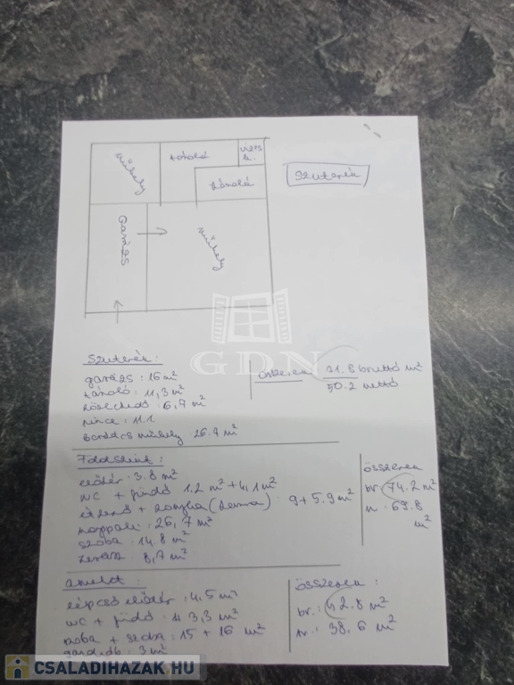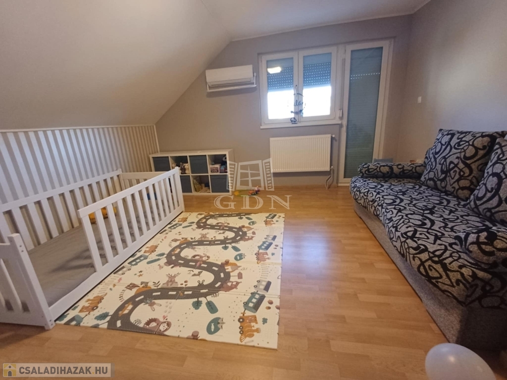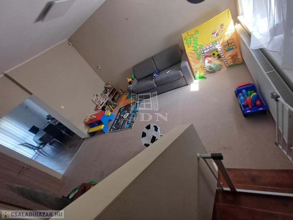 A szuterén szinten garázs, tárolók és vizes helységek is megtalálhatóak, 72 m2, az első emeleten nappali és szoba, étkező, gardrób, fürdő és mellékhelyiség, terasszal 74.5 m2, a felső szinten szintén vizes helysége, 2 szoba, terasz 43 m2.