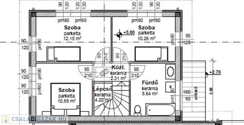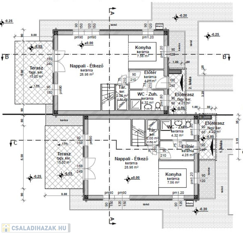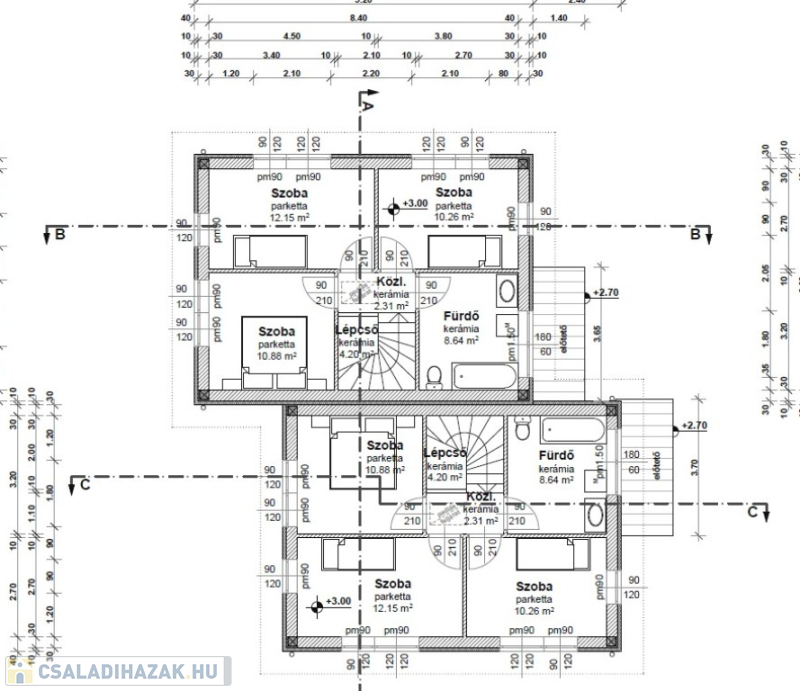 Műszaki:Vasbeton sávalap, dupla fal a lakások között , 30-as Porotherm tégla teherhordó falak, 10-es Porotherm válaszfalak, vasbeton közbenső és fa emeleti födém. A külső falak 12 cm-es Dryvit hőszigeteléssel, az emeleti födém 30 cm-es (fújható cellulóz )hőszigeteléssel készül, cserép héjazással. Nyílászárók(Schüco típusú ) 3 rétegű hő- és hangszigetelő thermo üveggel, kívül,belül fehér színben. Fűtés és a meleg víz hőszivattyúról H tarifával, mindenhol padlófűtés . 1 darab hűtő -fűtő klíma 3,5KW-os nappaliban , összesen 5 db. klíma kiállás a hálószobákban,nappaliban, lépcsőházban.