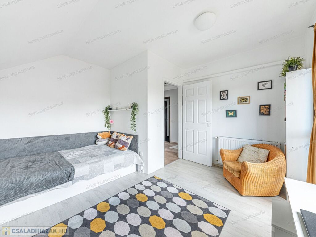A HÁZ ELOSZTÁSA A TÖKÉLETES CSALÁDI OTTHON KÉNYELMÉT BIZTOSÍTJA: földszintjén világos amerikai konyhás nappali, szülői háló, fürdőszoba és tároló, az emeleten pedig kettő hálószoba, fürdőszoba és egy mosókonyha található.