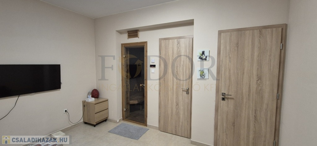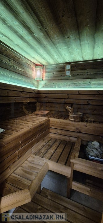 A tágas nappali–étkező–konyha a családi élet központja, míg a külön nyíló hálórész biztosítja a nyugodt pihenést. A ház egyik különlegessége a saját wellness rész: zuhanyzóval és finn szaunával.