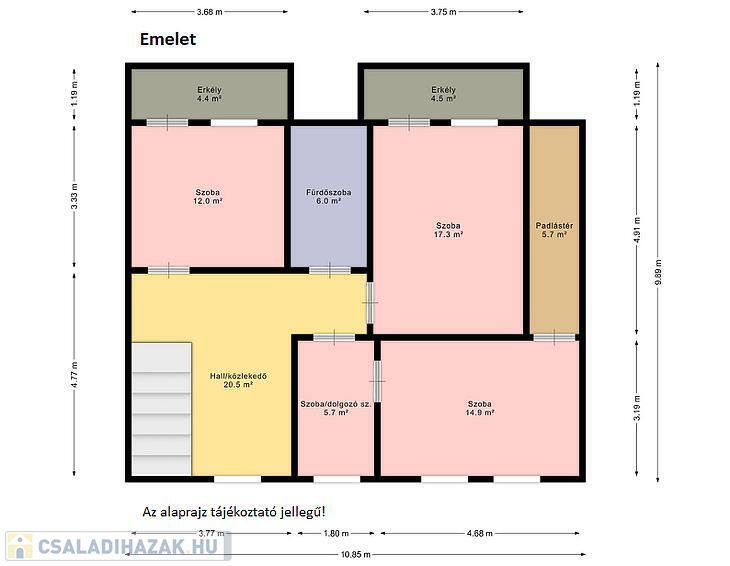 KIVÁLÓ ELOSZTÁSSAL ÉS ÁTALAKÍTÁSI LEHETŐSÉGEKKEL RENDELKEZIK: A FÖLDSZINTEN két szoba, konyha, étkező és egy külön WC található, AZ EMELETEN három hálószoba, egy gardrób, egy hall, valamint két darab 7 nm-es erkély biztosít kényelmes életteret.