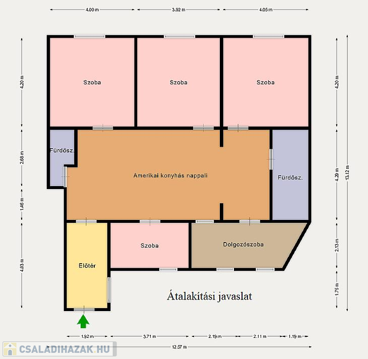 A ház adottságainak köszönhetően lehetőség nyílik egy fantasztikus elosztású, amerikai konyhás nappali + 4 hálószobával rendelkező családi otthon kialakítására, melyről átalakítási javaslat is látható a képek között.