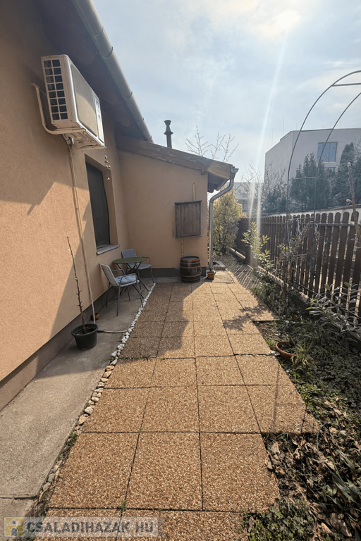 A lakáshoz tartozik egy kerítéssel leválasztott, saját használatú, 110 m²-es terasz, amely kiváló lehetőséget biztosít pihenésre, kertészkedésre, grillezésre vagy családi, baráti összejövetelekre.