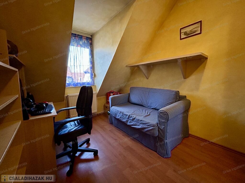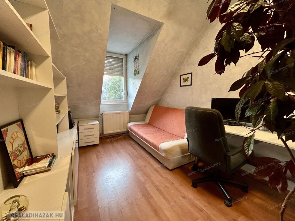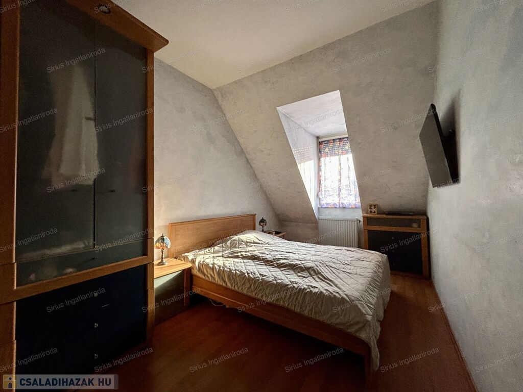 Csendes, átmenő forgalomtól mentes mellékutcában helyezkedik el, belső kétszintes, az alsó szint biztosítja a tulajdonos számára nappali életteret, a felső szinten pedig a hálószobák, valamint a fürdőszoba került kialakításra.