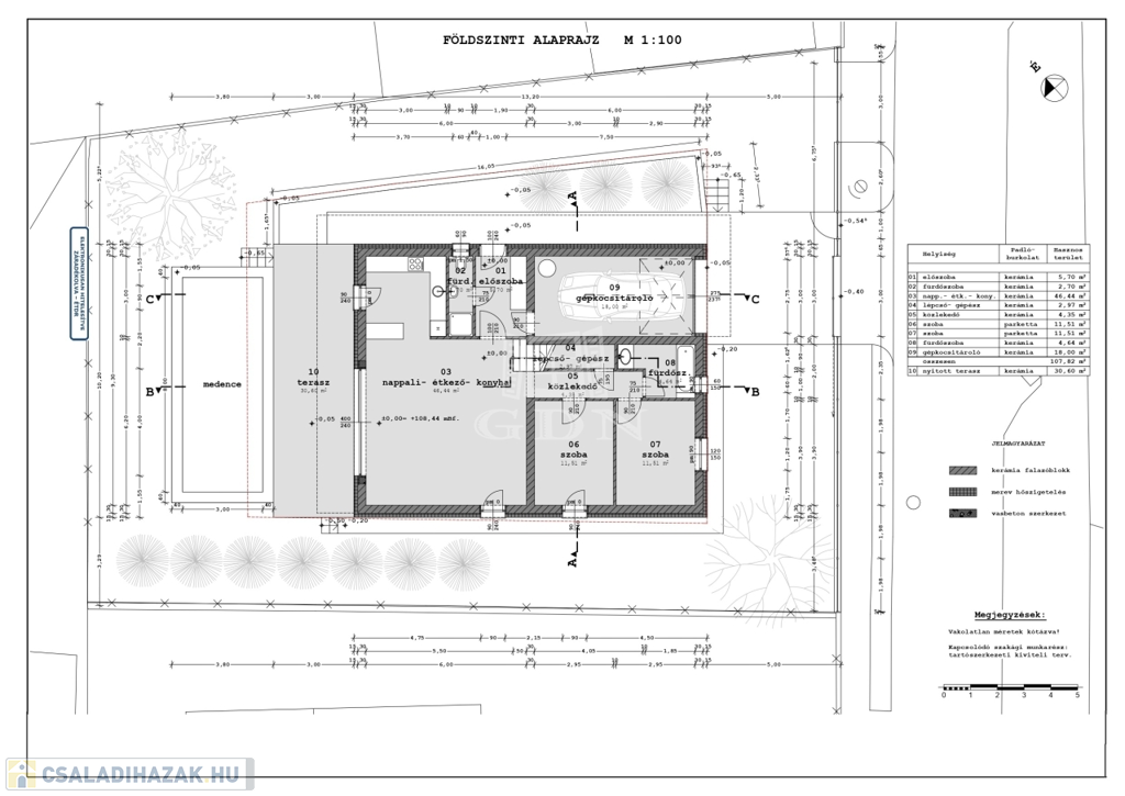 •Szerkezet: Monolit vasbeton sávalap (C20-as betonminőség), 30 cm-es szigetelésű betonfödémmel, homlokzati fal 15 cm-es, lábazatra 10 cm-es hőszigetelés kerül felhelyezésre.