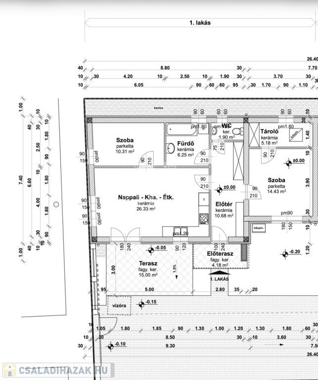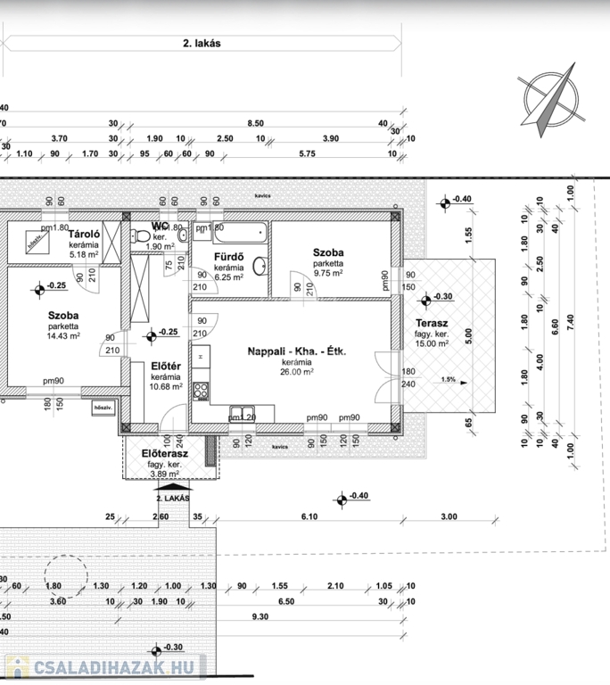-előszoba(10,68m2), amerikai konyha nappali(26m2), 2 szoba(9,75m2, 14,43m2), fürdőszoba(6,25m2), WC(1,9m2), tároló(5,18m2), valamint 15 m2 és 3,89 m2-es terasz.