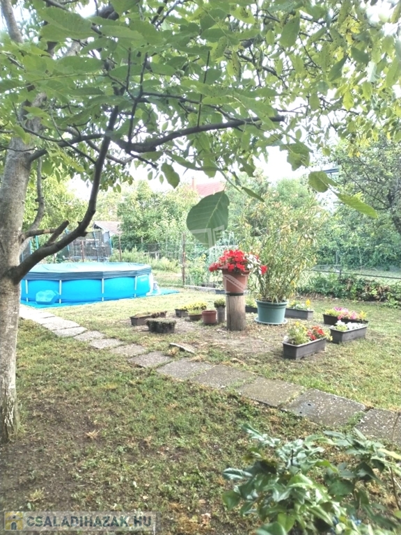 Tágas kert: örökzöldek, diófa és rózsabokrok biztosítják a nyári árnyékot és a privát pihenést!