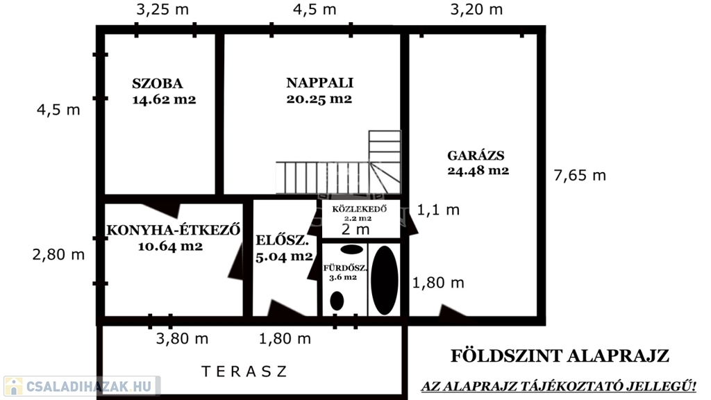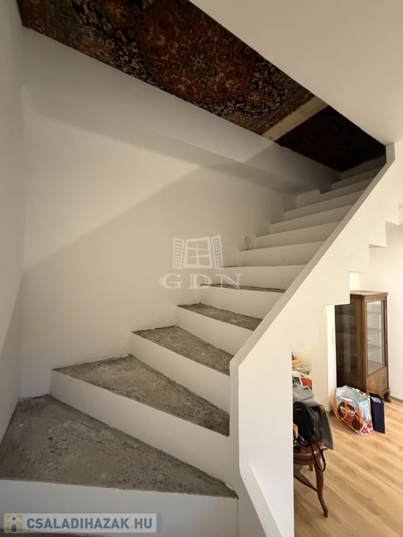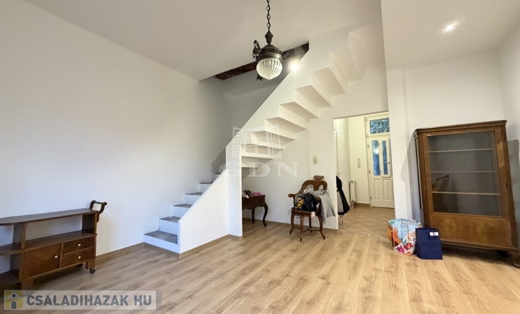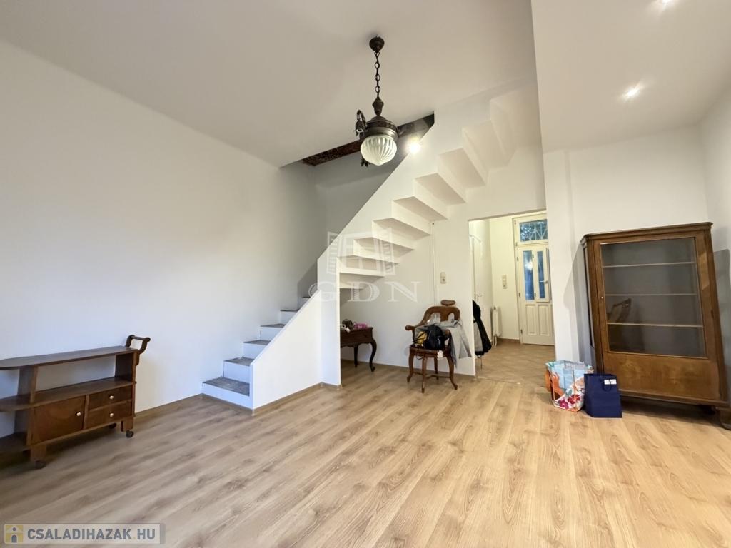 A földszinten egy tágas előszoba-közlekedőbe léphetünk be, innen nyílik egy világos nappali amelyben egy frissen kialakított modern lépcső vezet fel a tetőtérbe.