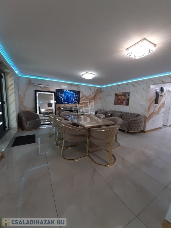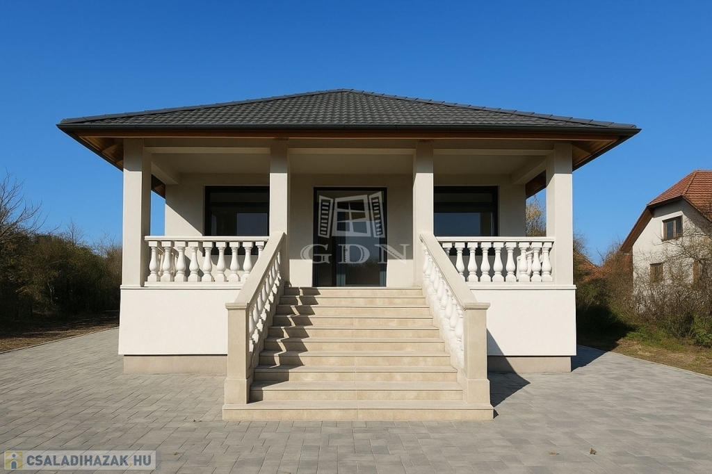 A ház alatti alsó szint 110 m2, ahol beépített konyha, kamra, kis szoba, zuhanyzós fürdőszoba WC-vel is kialakításra került, plusz egyéb tárolásra alkalmas terület is maradt.