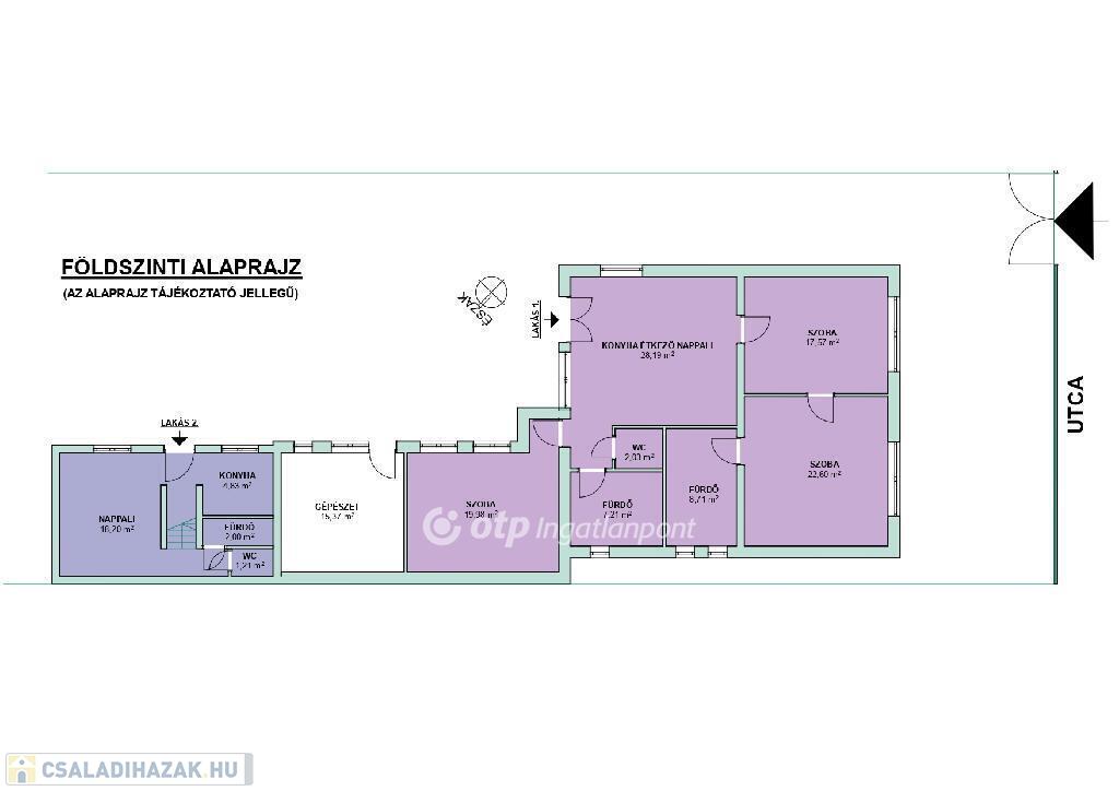 Az épületen belül a három lakás a mellékelt alaprajz szerint helyezkedik el. Az 1. lakás 122m2, a 2. lakás, ami két szintes nettó 35m2-es, a 3. lakás pedig 86m2-es.