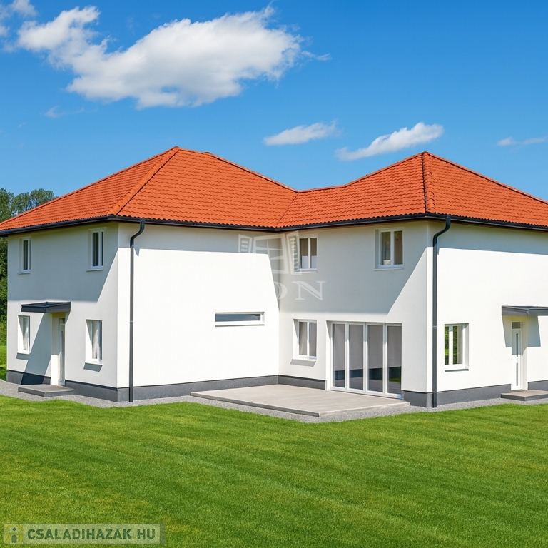 MODERN, HŐSZIVATTYÚS, ÚJÉPÍTÉSŰ, KULCSRAKÉSZ IKERHÁZ zöld környezetben.