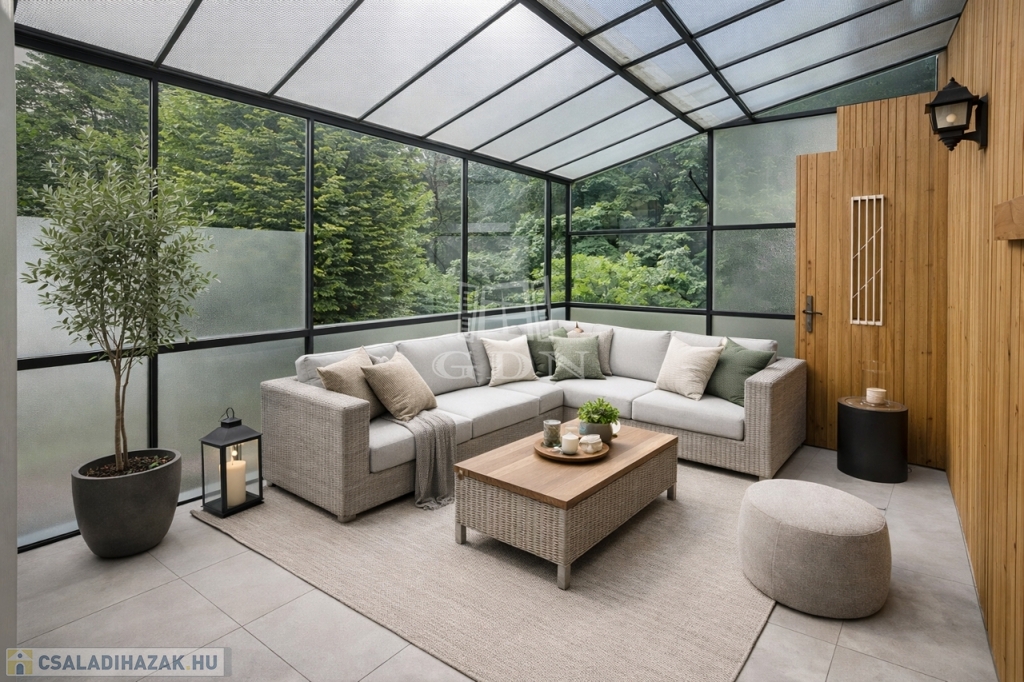 XXII.ker. BUDATÉTÉNY csendes kertvárosi részén, aszfaltos mellékutcában, 180 m2-es, 6 szobás, TÉGLAÉPÍTÉSŰ családi ház + 40 m2 különálló, klímás vendég ház, 1640 m2-es telekkel eladó.