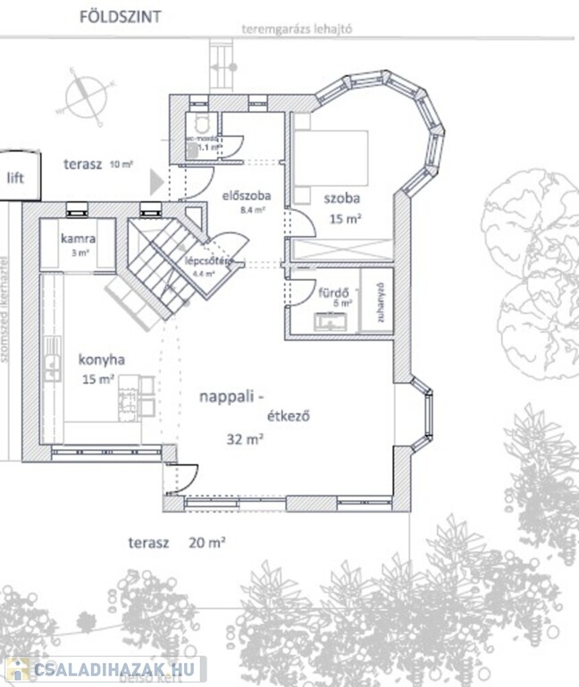 • nagyterű NAPPALI (kb. 45nm), plusz az alsószinti terasz fölé nyúló kertre néző TERASZ (kb. 7nm),