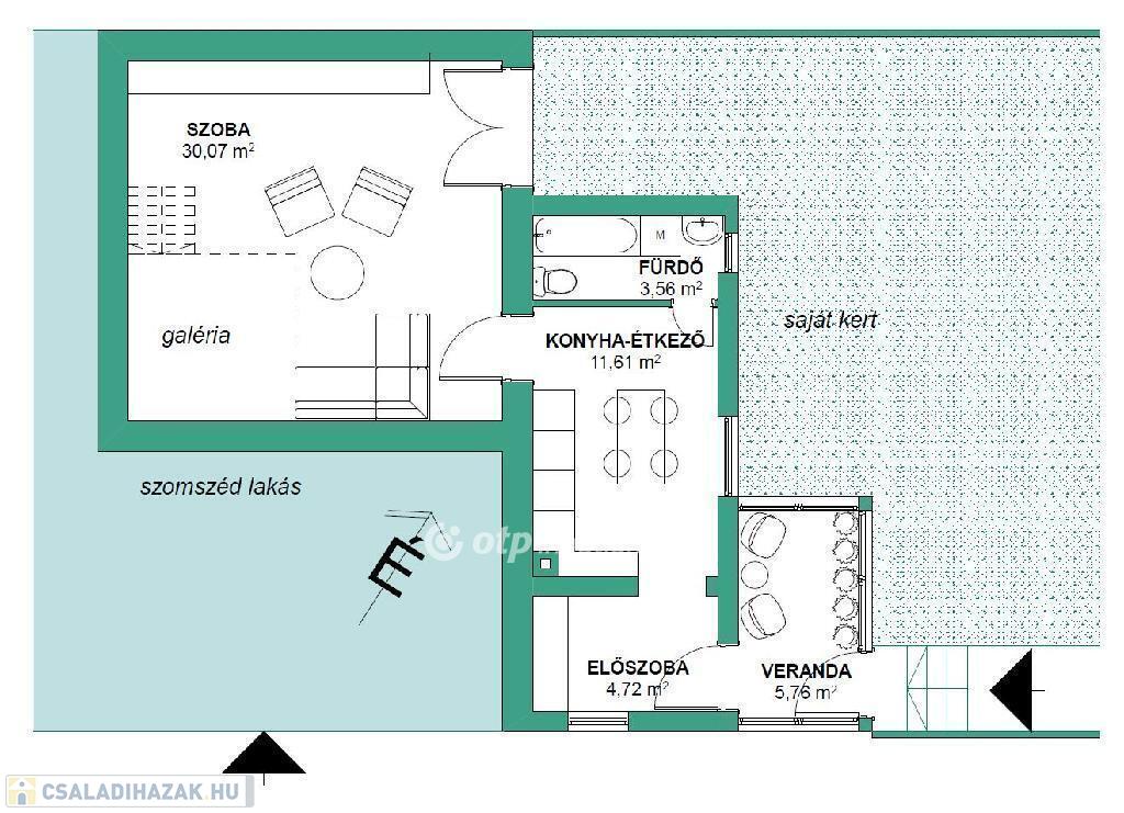 A kerten keresztül érkezünk a bejárati verandára, majd az előszobába. A lakásban egy jól felszerelt konyha-étkező, egy fürdőszoba és egy nagy méretű, nagy belmagasságú, alvó galériával kibővített szoba található. Innen egy terasz ajtón keresztül a kertbe juthatunk.