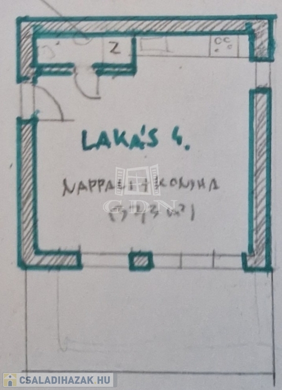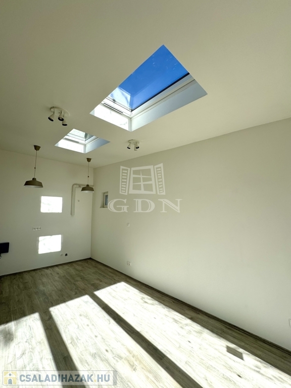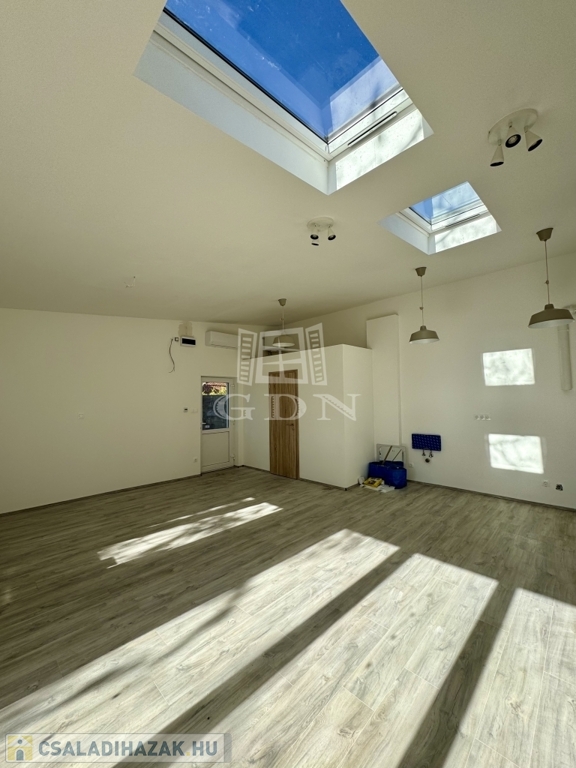 Jelenleg egy tágas, 37 nm-es, amerikai konyhás nappaliból áll, amelyet két különleges felülvilágító ablak tesz egész nap világossá.
