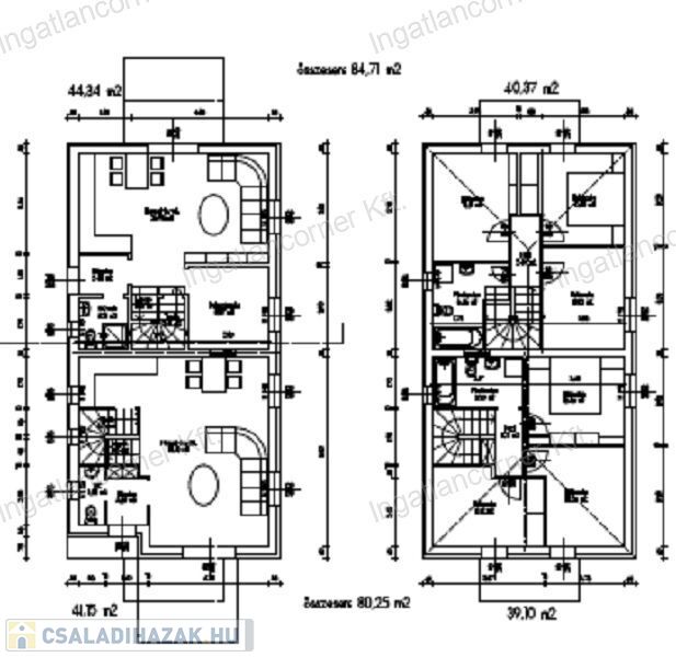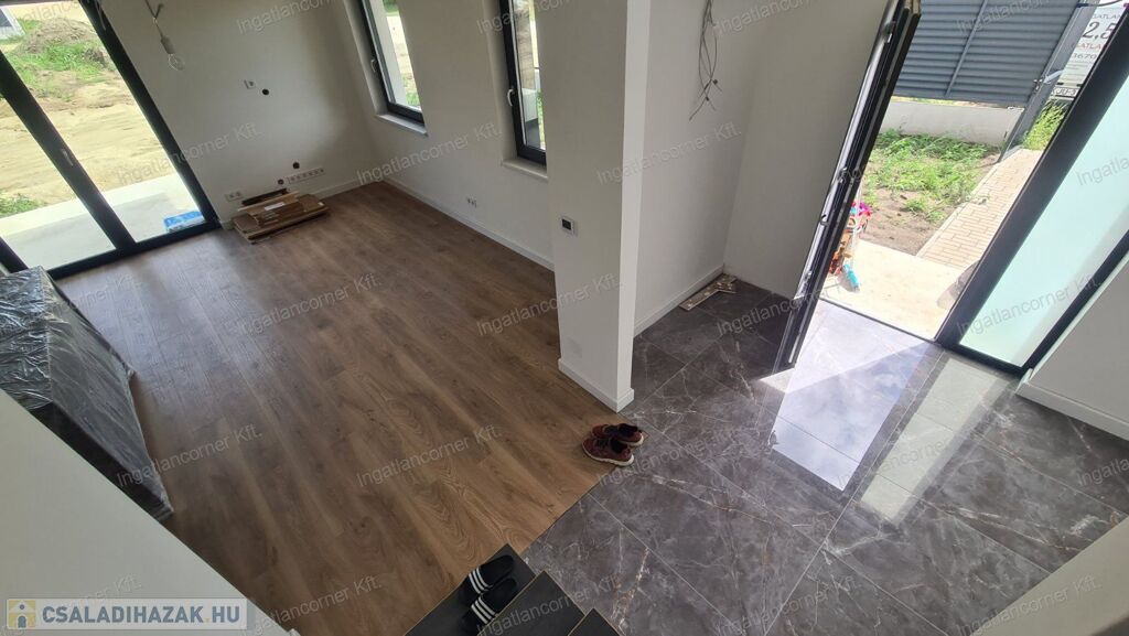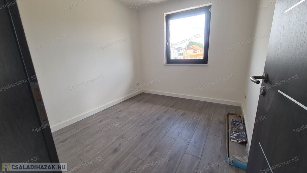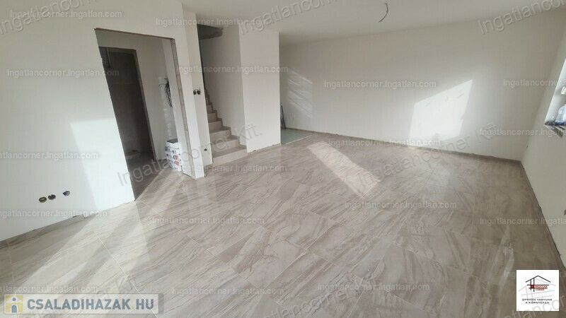 Az ingatlan első lakása alapterülete 86 m2 +5 m2 erkély, telekméret 205 m2 104 M Ft.