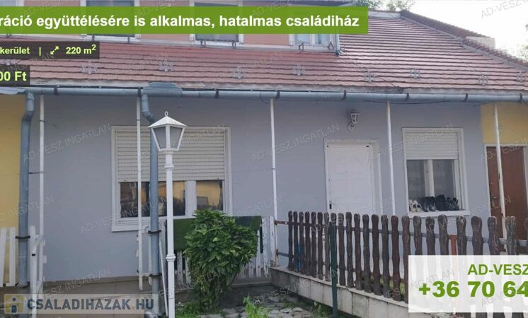 Budapest XXIII. kerületében, Soroksár csendes részén eladó egy vegyesfalazatú, (vályog, és tégla) 220m²-es családi ház, 440m²-es, két utcára nyíló saroktelken.