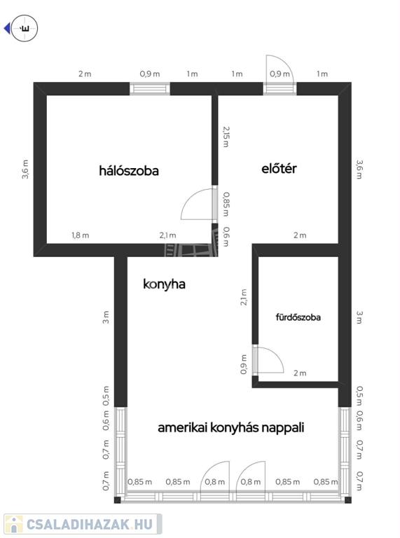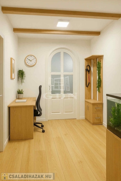 A földszinten helyezkedik el az amerikai konyhás nappali étkezővel, egy hálószoba, egy dolgozóként kialakított előszoba, valamint a kádas fürdőszoba. Az emeleten egy vendégszoba kapott helyet.
