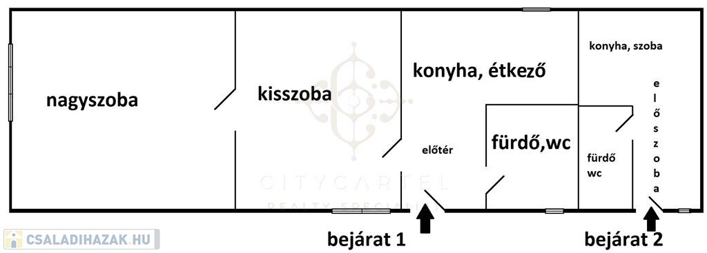 A Soroksárra jellemző beépítés miatt nem meglepő, hogy ez a ház is utcafronti. Ügyvéd általi megosztás a szomszéddal. A két telek jelenleg is egymástól téglakerítéssel leválasztott. A hosszú tornácról az első bejáraton a nagyobb, 55 nm-es lakásba érkezünk. Az előszoba bal oldalán két egybenyíló világos szoba helyezkedik el. Az utcafronti a nagyobb, 24 nm-es, a kisebbik 19 nm-es. Szemben az étkezős konyha, jobb oldalon pedig a zuhanyzós fürdő és WC. A zárt rendszerű gázcirkó is itt található, a fűtés és melegvíz erről megoldott.