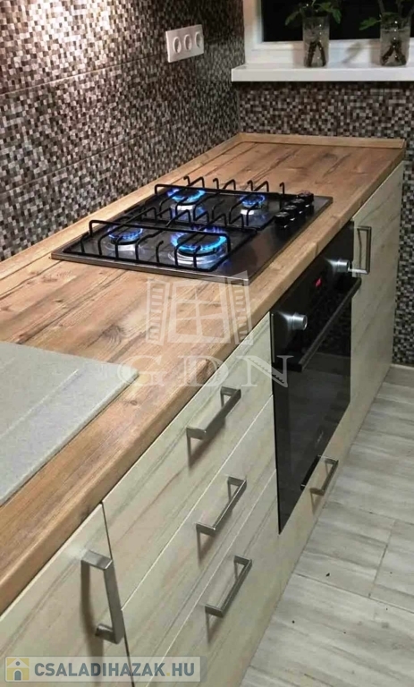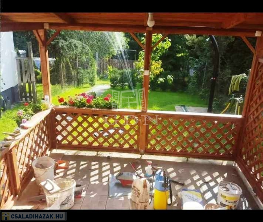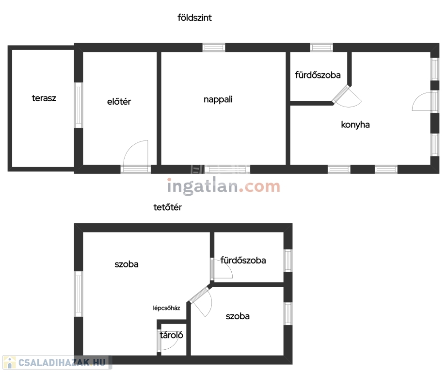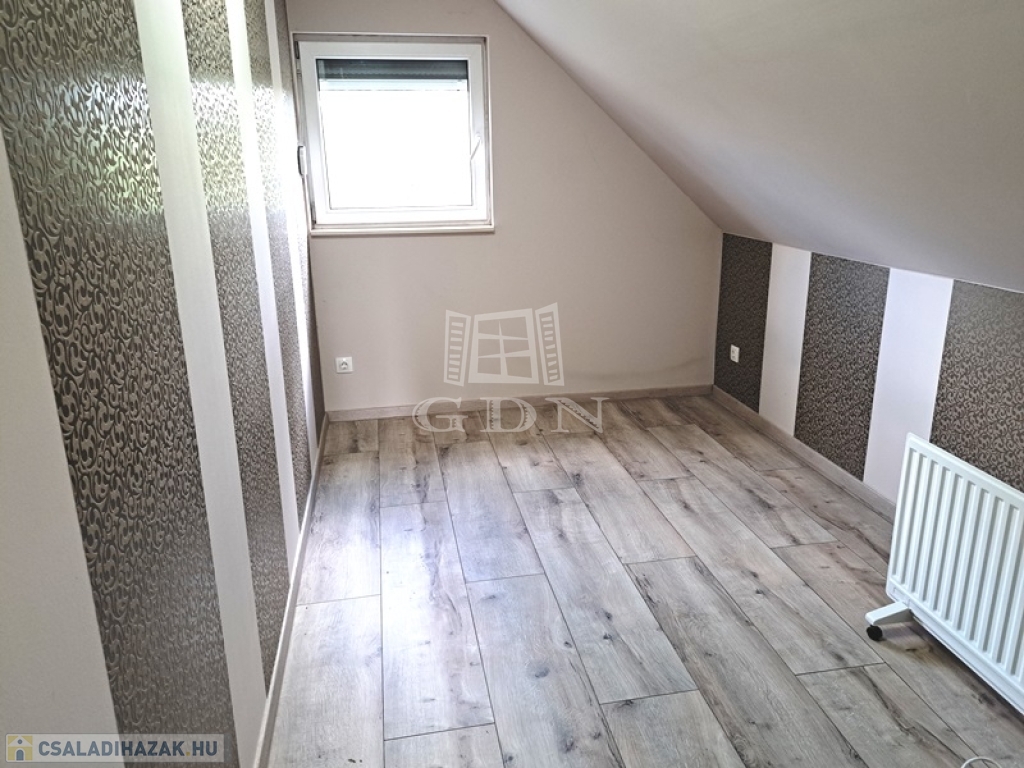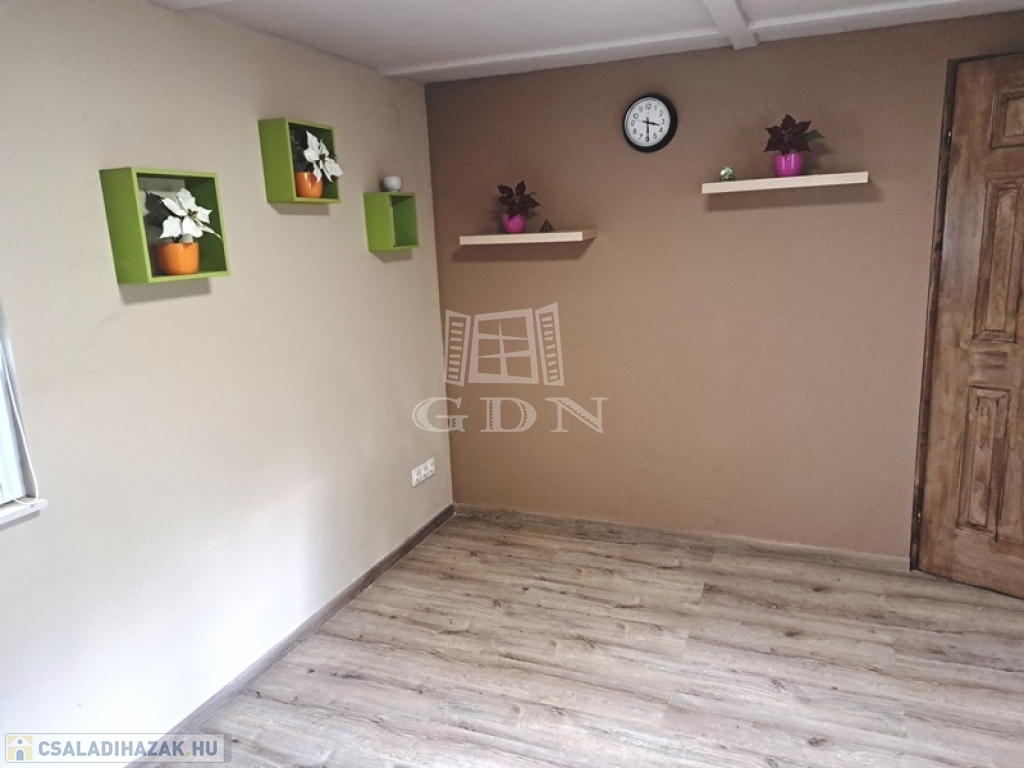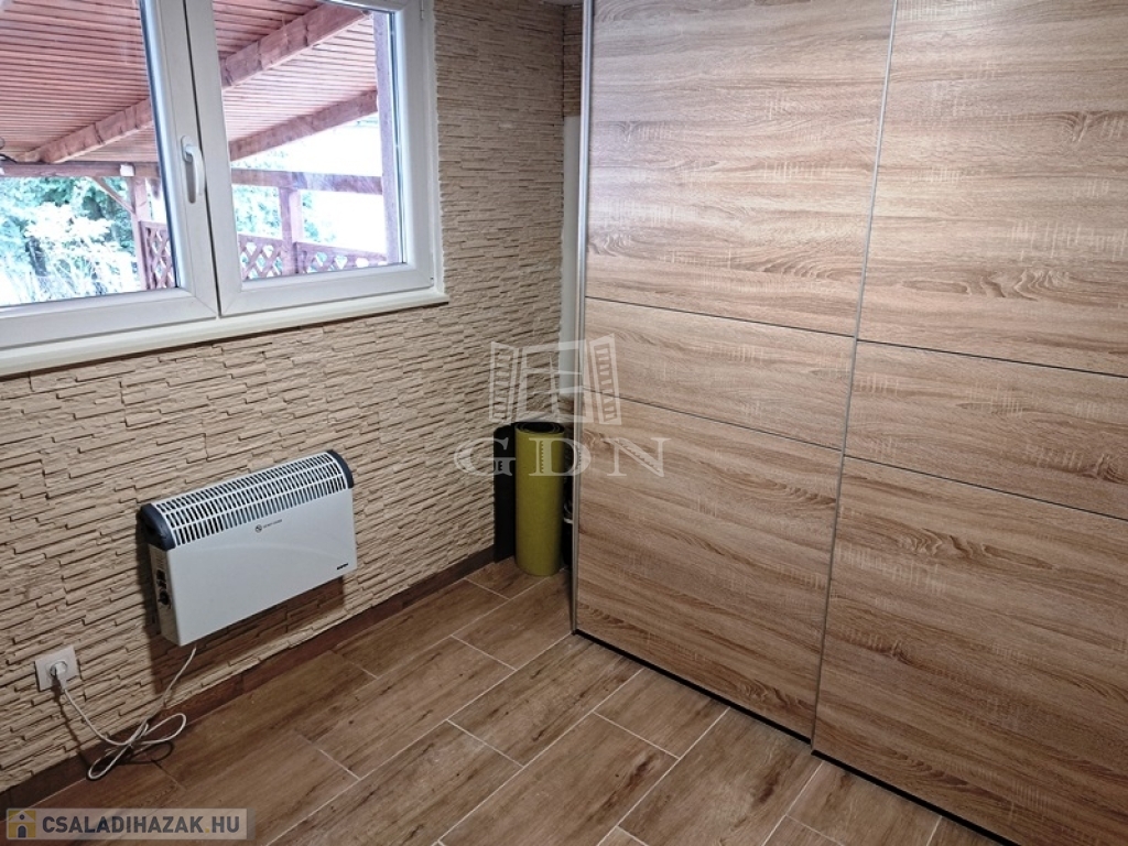 Helyiségei:alsó szint, előtér, nappali, konyha/étkező, fürdőszoba zuhannyal, fedett terasz, felső szint, 2 szoba, fürdőszoba, tároló.