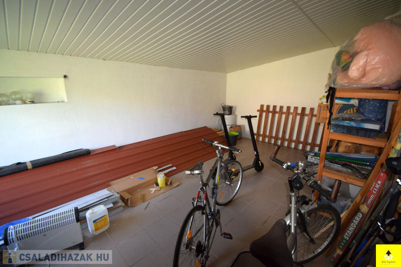 Az 50 m2-es épülethez kapcsolódik egy egyállásos garázs, továbbá a telken található még egy különálló tároló és egy két állásos fedett kocsibeálló.