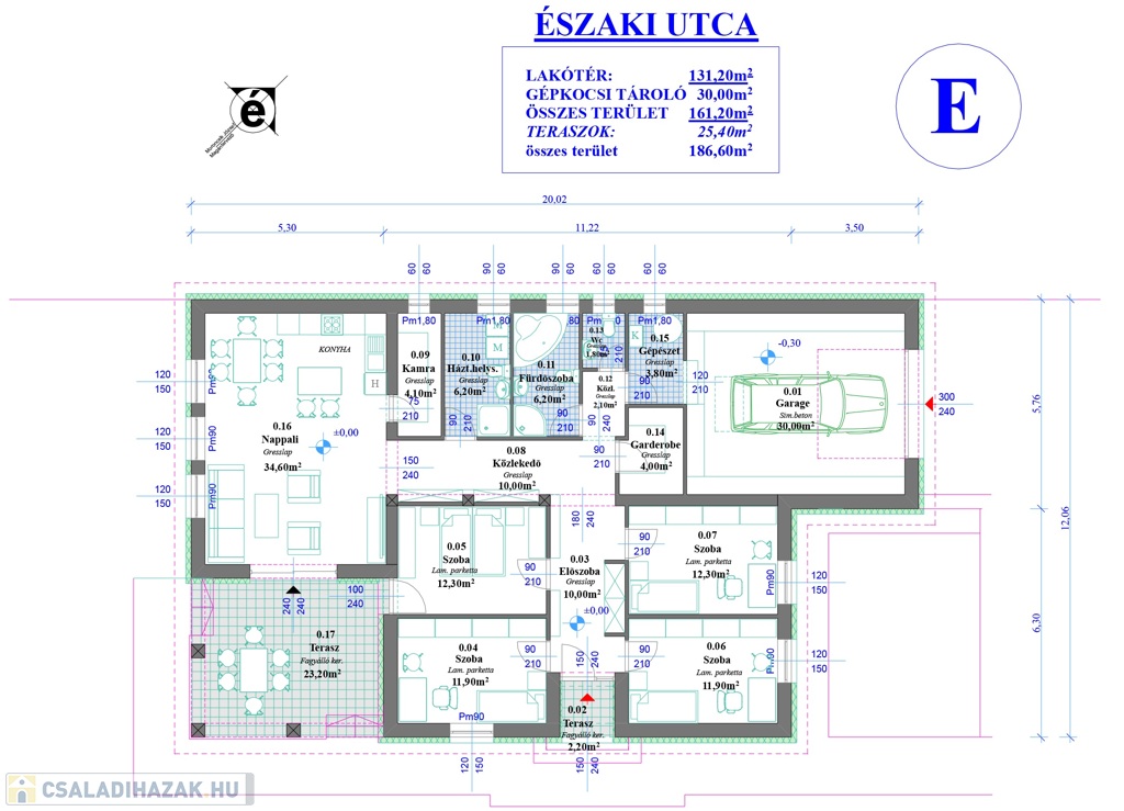 A Nappali +amerikai konyha + 4 szoba + kiszolgáló helyiségek + terasz helyiségekből álló önálló családi ház megtervezett alaprajza az Ön igényeinek leginkább megfelelően módosítható! A nettó alapterület 173,9 nm.