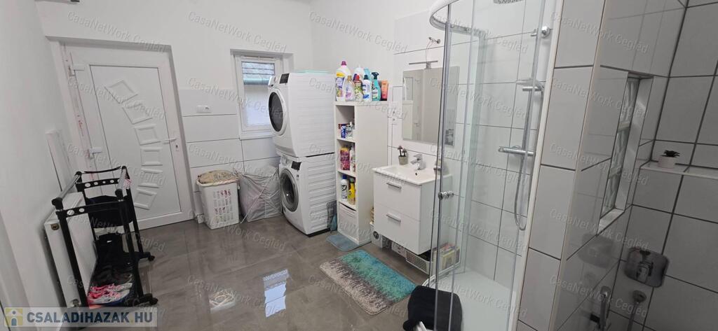 A ház egyik nagy előnye a két fürdőszoba/mosókonyha, amely a mindennapi használat során jelentős kényelmet biztosít, különösen több generáció vagy nagyobb család esetén. A konyha folytatásában található egyik szoba már alkalmas egy különálló lakrész kialakítására, amely saját szobával és fürdőszobával rendelkezik, az elszeparáláshoz mindössze egy ajtó beépítése szükséges. Ez a megoldás ideális lehet idős családtagnak, fiatal felnőttnek vagy akár dolgozószobának is.